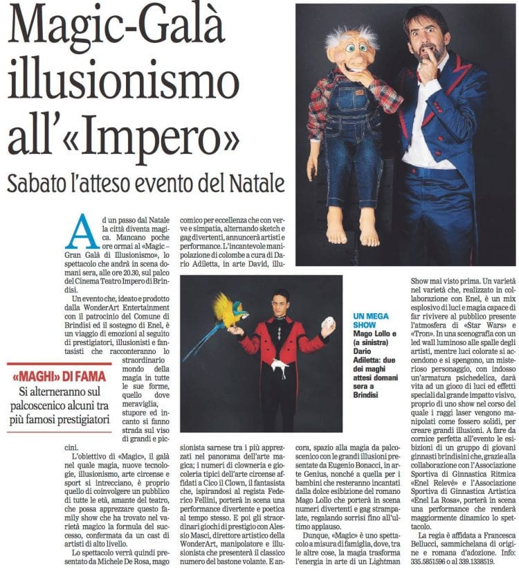 «Magic – Gran Galà di Illusionismo» sulla Gazzetta del Mezzogiorno di oggi (21 dicembre). 😉 Noi vi aspettiamo domani, sabato 22 dicembre (ore 20.30), al Cinema Teatro Impero di #Brindisi! Non mancate!